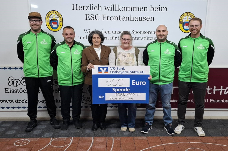 Anlässlich seines 50-jährigen Vereinsjubiläums spendete der ESC Frontenhausen an Robin Hood e.V. 500 €. Durch großzügige Unterstützung der eingeladenen Vereinen im Jubiläumsturnier kam diese großartige Summe zusammen. Erste Vorsitzende Claudia Heitzer und Schatzmeisterin Hildegard Denk nahmen den Scheck von Erstem ESC-Vorsitzenden Michael Hasreiter mit großer Freude entgegen.